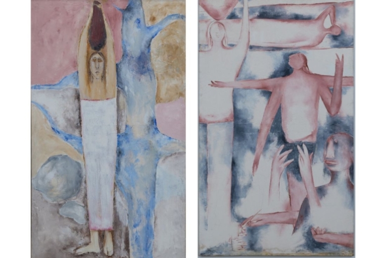 Haku Shah, Untitled, 55 x 32.5 in, Oil on Canvas (left) | Haku Shah, Humne, 2003, 55 x 33 in, Oil on Canvas(right)